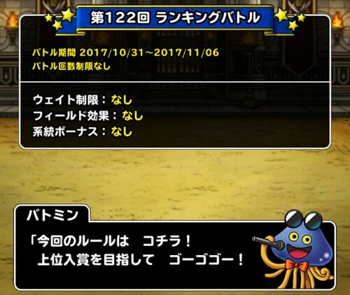 こんにちは、青い月です。 本日から開催されました第122回ランキングバトル。ルールは下記の通りです。無制限リーグです。魔王蔓延る厳しい無制限の戦いです。特に今話題の『はげしいおたけび』を魔剣士ピサロに付与されている方と当たると、先制でマインド…
